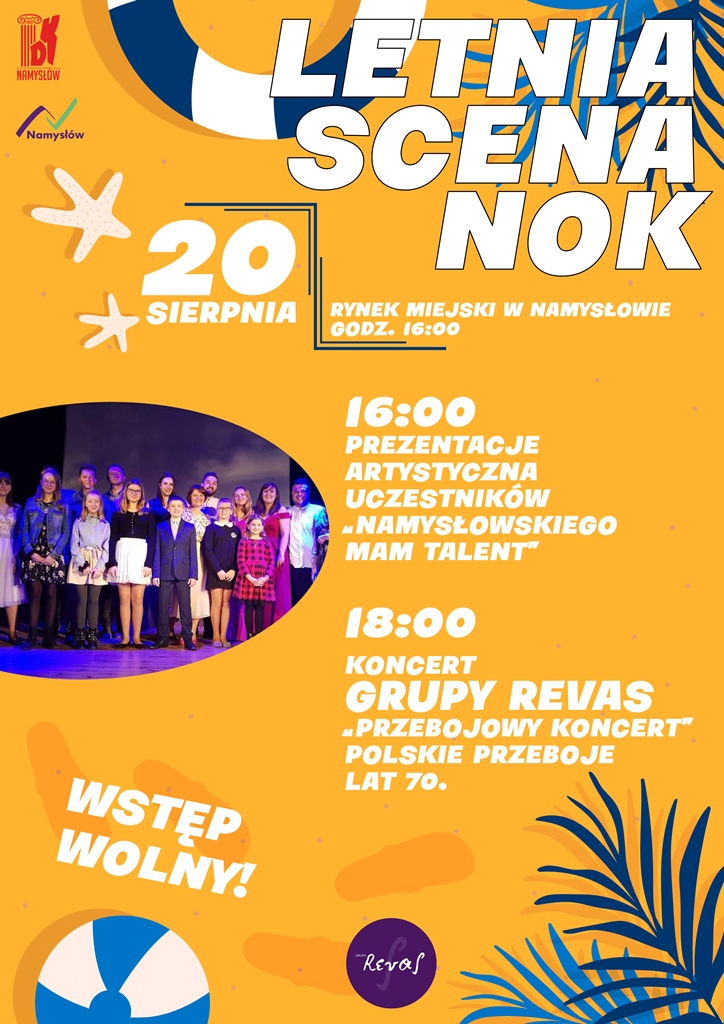 20 sierpnia zapraszamy na Namysłowski Rynek, aby podziwiać uczestników "Namysłowskiego Mam Talent" - organizowanego przez Młodzieżową Akademię Lidera oraz usłyszeć przeboje lat 70. w wykonaniu Grupy Revas