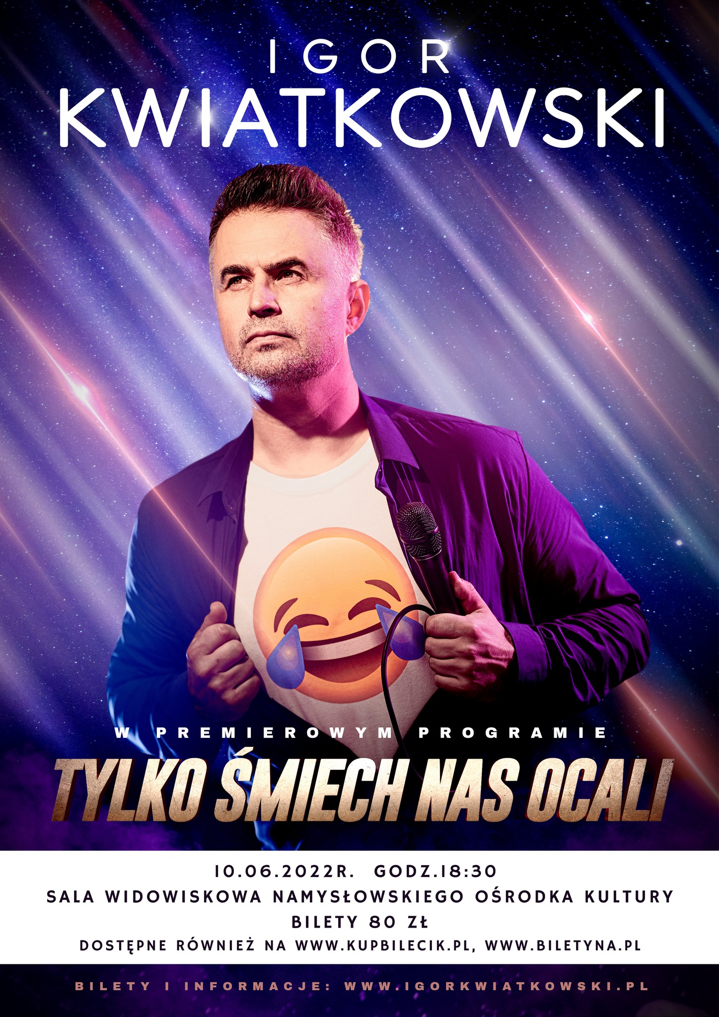 10 czerwca 2022 roku o godz. 18:30 w Namysłowskim Ośrodku Kultury Igor Kwiatkowski wystąpi dla Państwa w premierowym programie "Tylko śmiech Nas ocali"